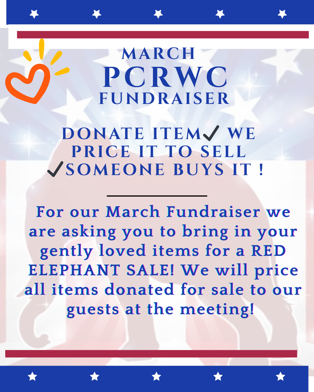 In addition, do you have items stored in a closet that you haven’t wanted to give away, but someone might love them? Help us with our March fundraiser! We would like your gently loved items for our meeting to SELL! Bring your item to our general meeting, we will display it, price it, and sell items! Our own quick turn-around fundraiser. Remember one man’s discard is another’s treasure! Help us raise funds for our club!